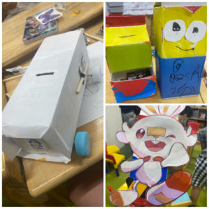 牛乳パックを使い、好きな形に切ったり色紙などを貼り付けたりしました